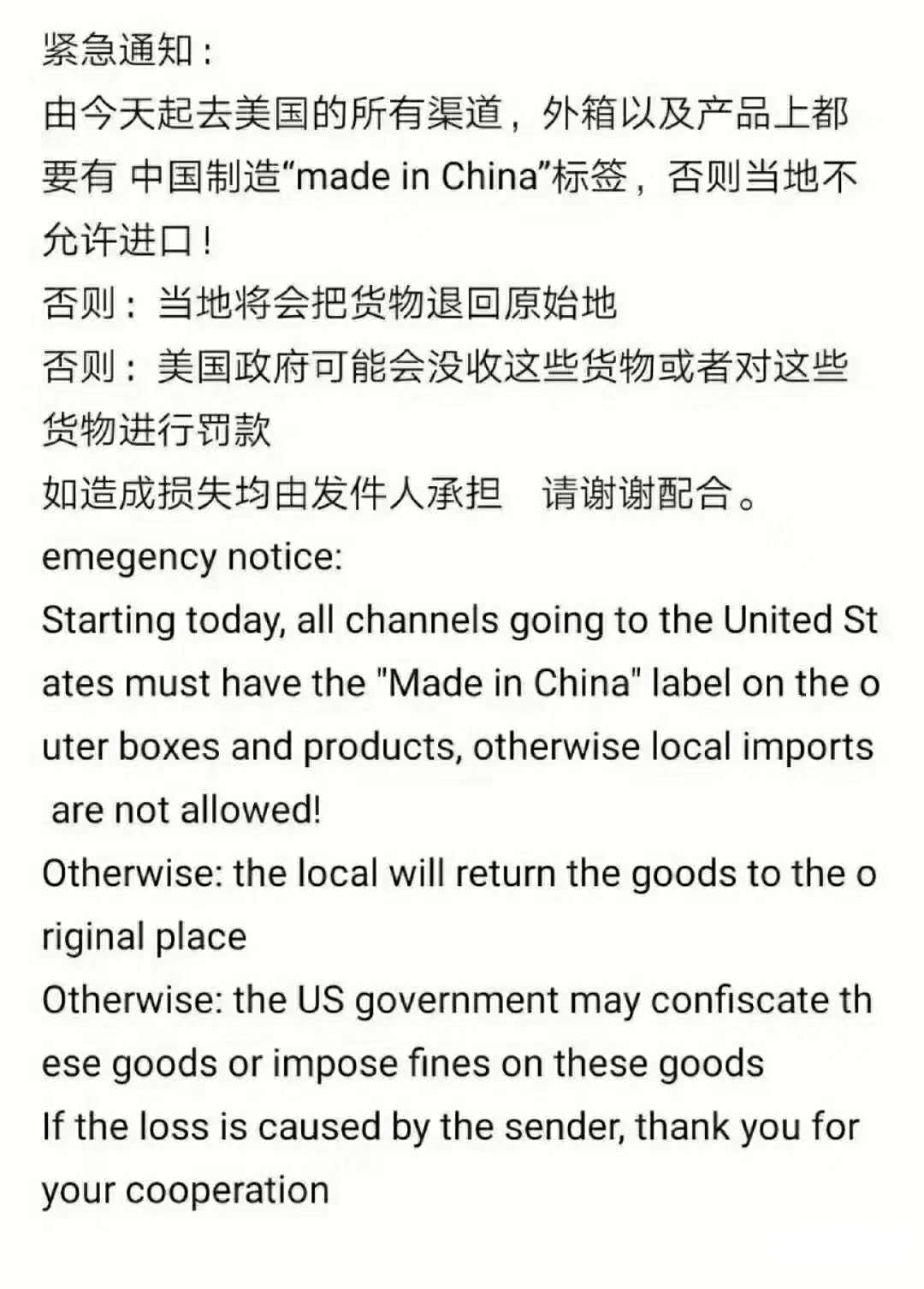 In accordance with the requirements of the new US customs border regulations, all channels going to the US from today on, the outer boxes and products must be affixed with the "Made in China" label, otherwise local imports are not allowed! You may also face risks such as returns, confiscation of goods or fines!